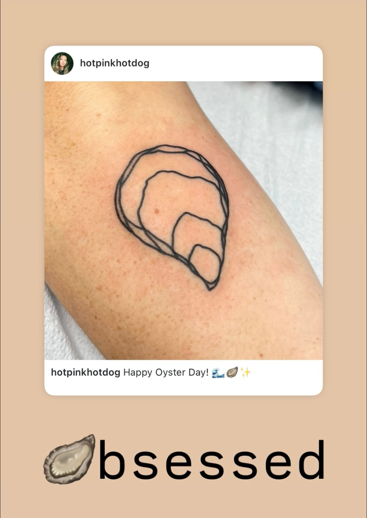 LC: Back when we first opened the shop, I had put out a few flash sheets, one of which was of linework oysters. It sat on my Instagram for a few months before someone got one. They were pre-drawn back then and now I do them all freehand. After I posted that first linework oyster tattoo on my Instagram, it just kind of took off. I honestly had no idea that was going to happen. I’m not even sure when I started using the hashtag [#cluboyster], but it’s been fun interacting with lots of people and hearing about #cluboyster tattoos being spotted in the wild.